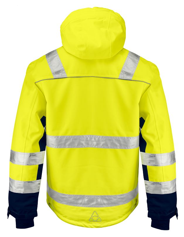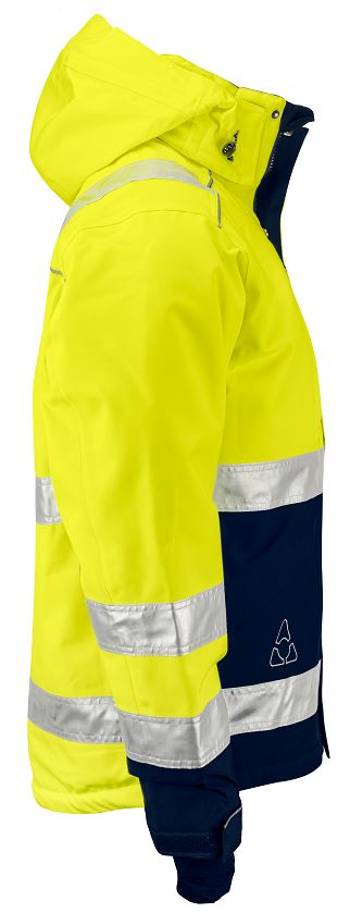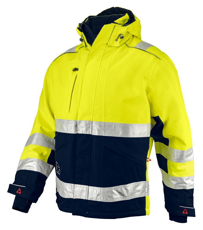 Funktionsvinterjacka i 100% polyester med PU-belagd baksida, tejpade sömmar och Quiltfoder. Materialet är vattentätt med god fukttransport. Vattenpelare: 6500 mm. Andasfunktion: 5000 Mvp. Certifierad enligt EN 20471 Klass 3.